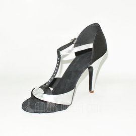 Women's Satin Heels Sandals Latin With Rhinestone T-Strap Buckle Dance Shoes by Amormoda