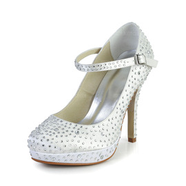Women's Satin Spool Heel Closed Toe Platform Pumps With Rhinestone by Amormoda