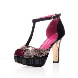 Suede Chunky Heel Sandals Peep Toe With Rhinestone shoes by Amormoda
