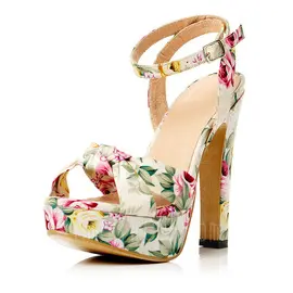 Amormoda - Cloth Chunky Heel Sandals Pumps Platform With Buckle Flower shoes